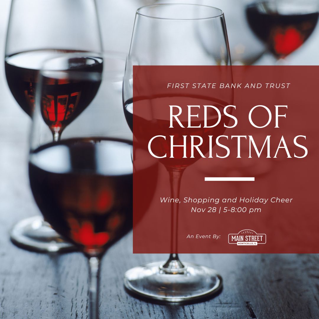 Mingle with old & new friends alike in Monticello this holiday season! There’s no better way to kick things off than with the First State Bank and Trust Reds of Christmas, a shop walk with wine, appetizers, and dessert tastes throughout our historic downtown. Ticketed guests will receive a commemorative tasting glass at check-in for red wine sampling while shopping.